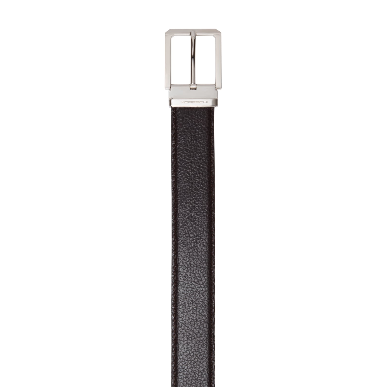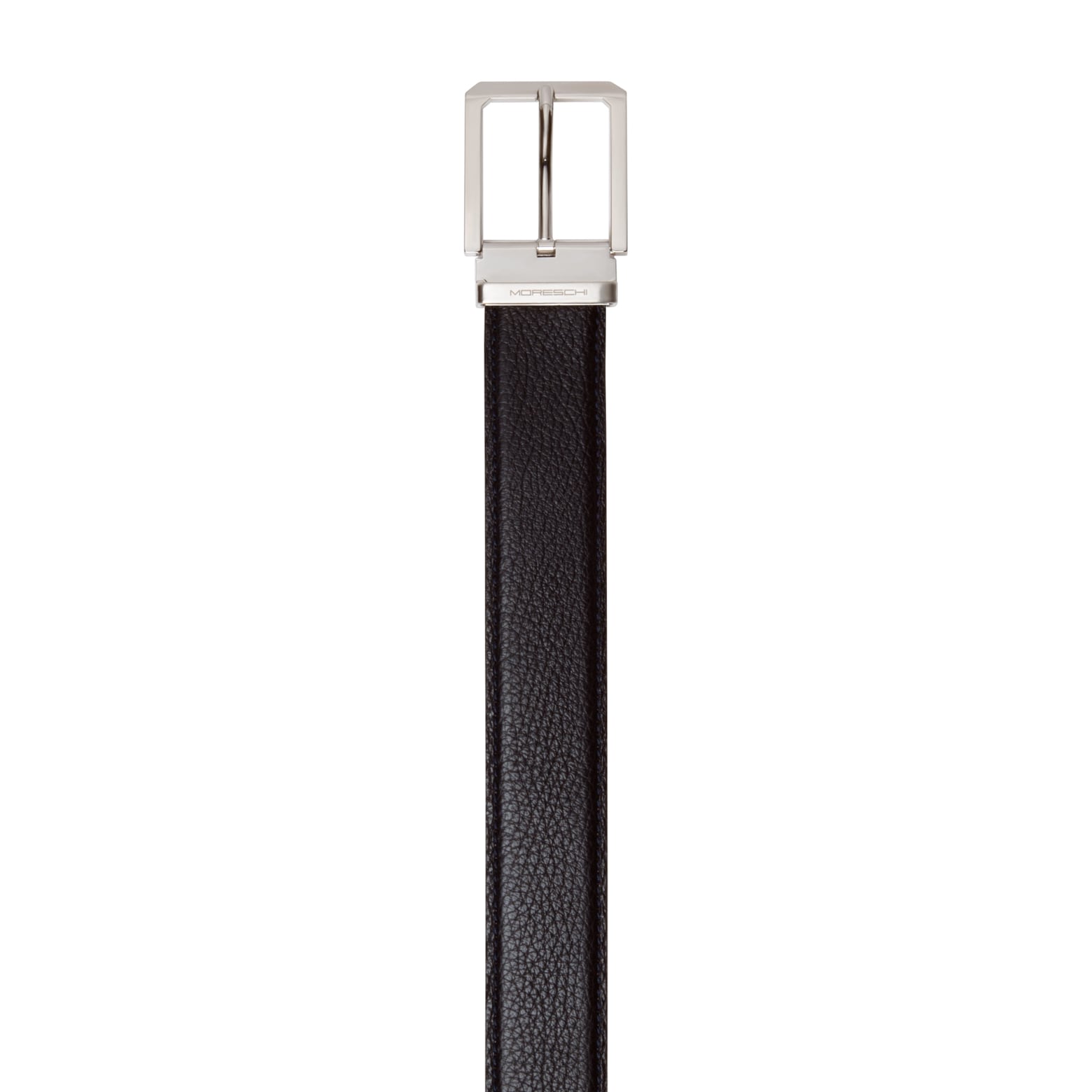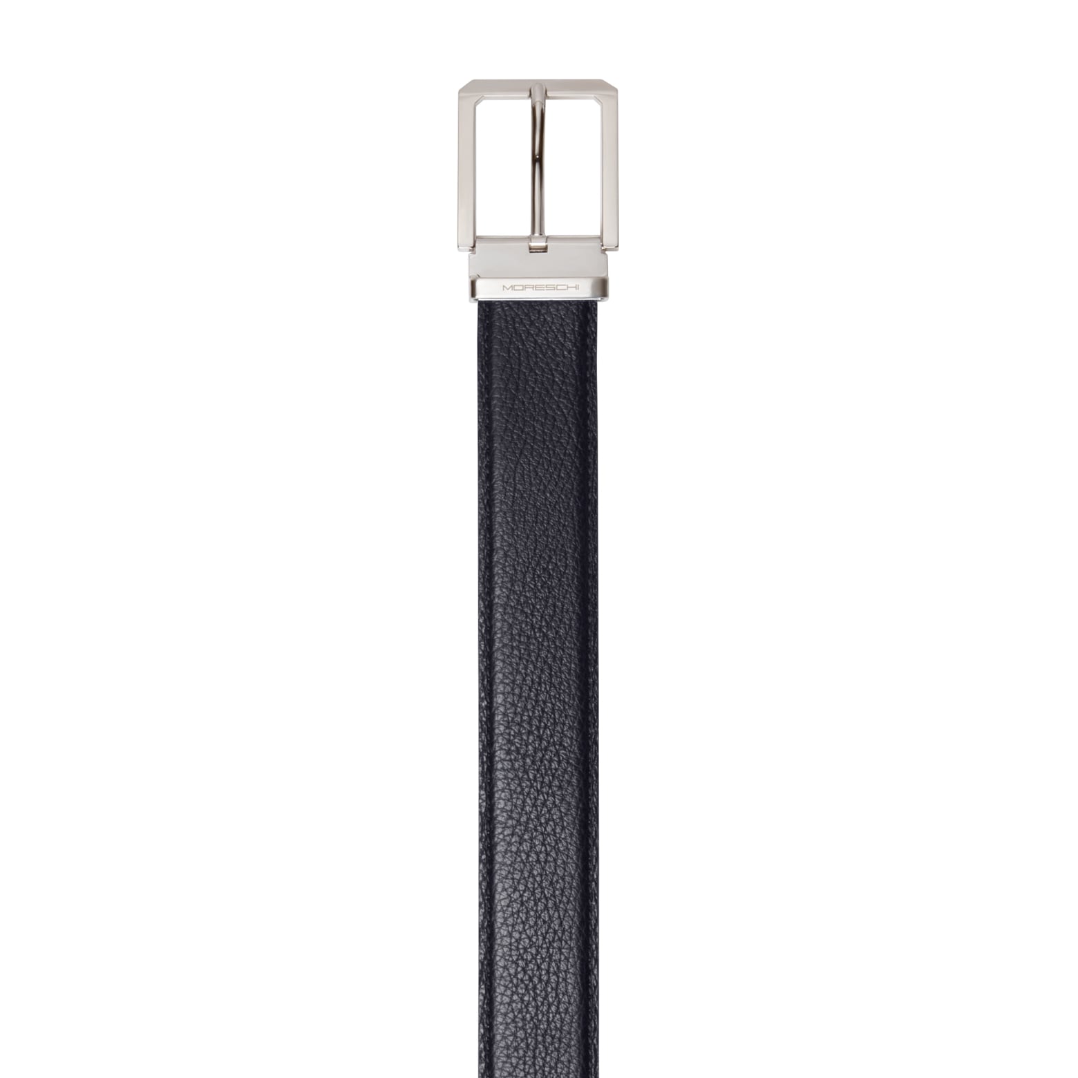 Cintura da uomo cucita, realizzata in morbido vitello dalla grana bottalata. Alta 35 mm, è proposta nel classico colore nero. Il terminale a punta dona al modello un carattere deciso e contemporaneo, mentre la fibbia squadrata in finitura argentata lucida con passante metallico personalizzato Moreschi aggiunge un tocco distintivo di eleganza sportiva. Perfetta in abbinamento alle calzature iconiche del marchio in morbido cervo, completa con stile ogni look formale o casual raffinato.