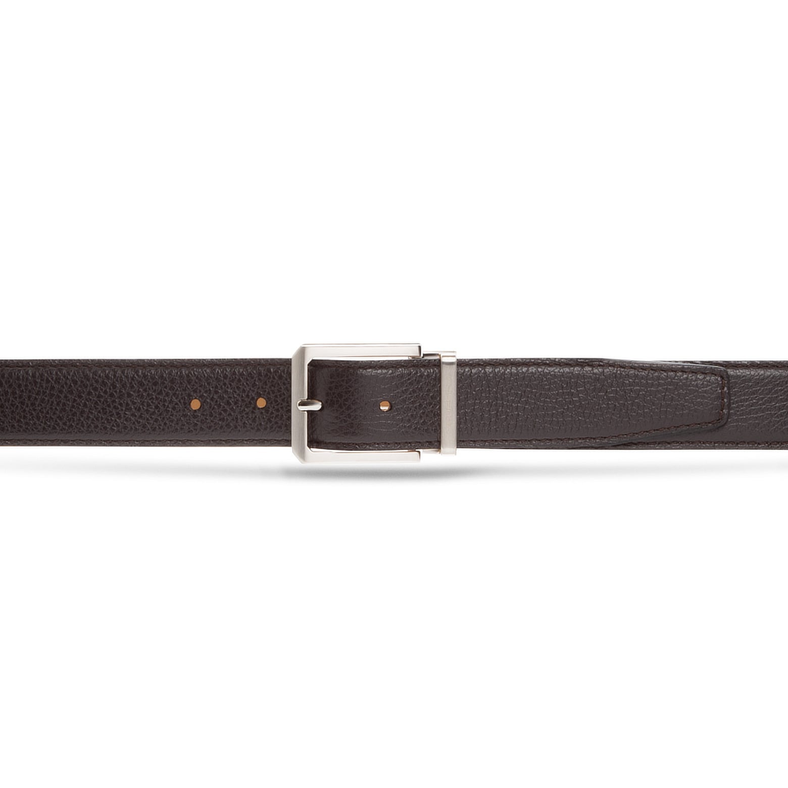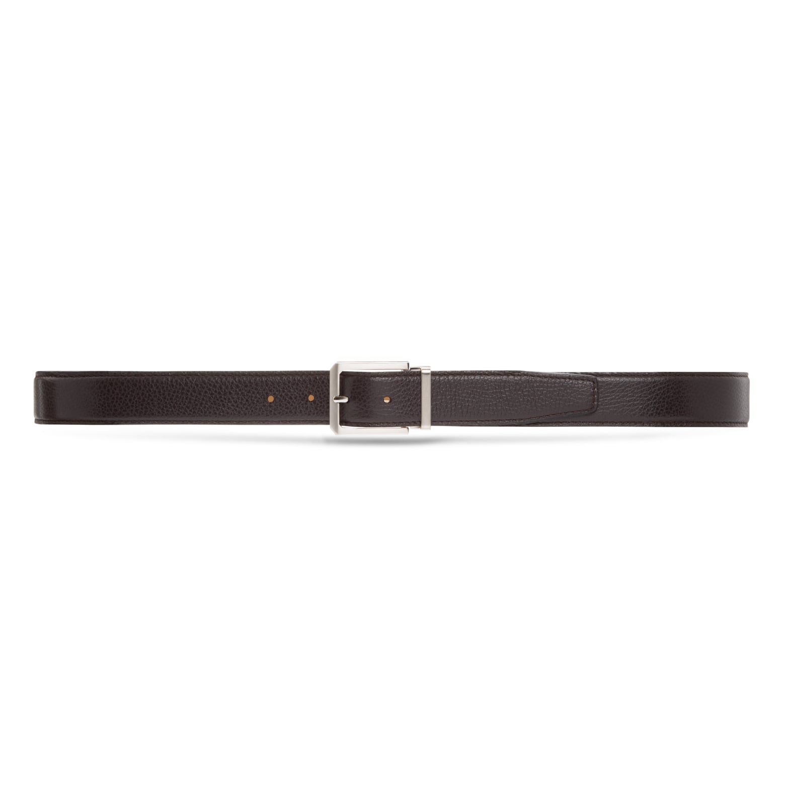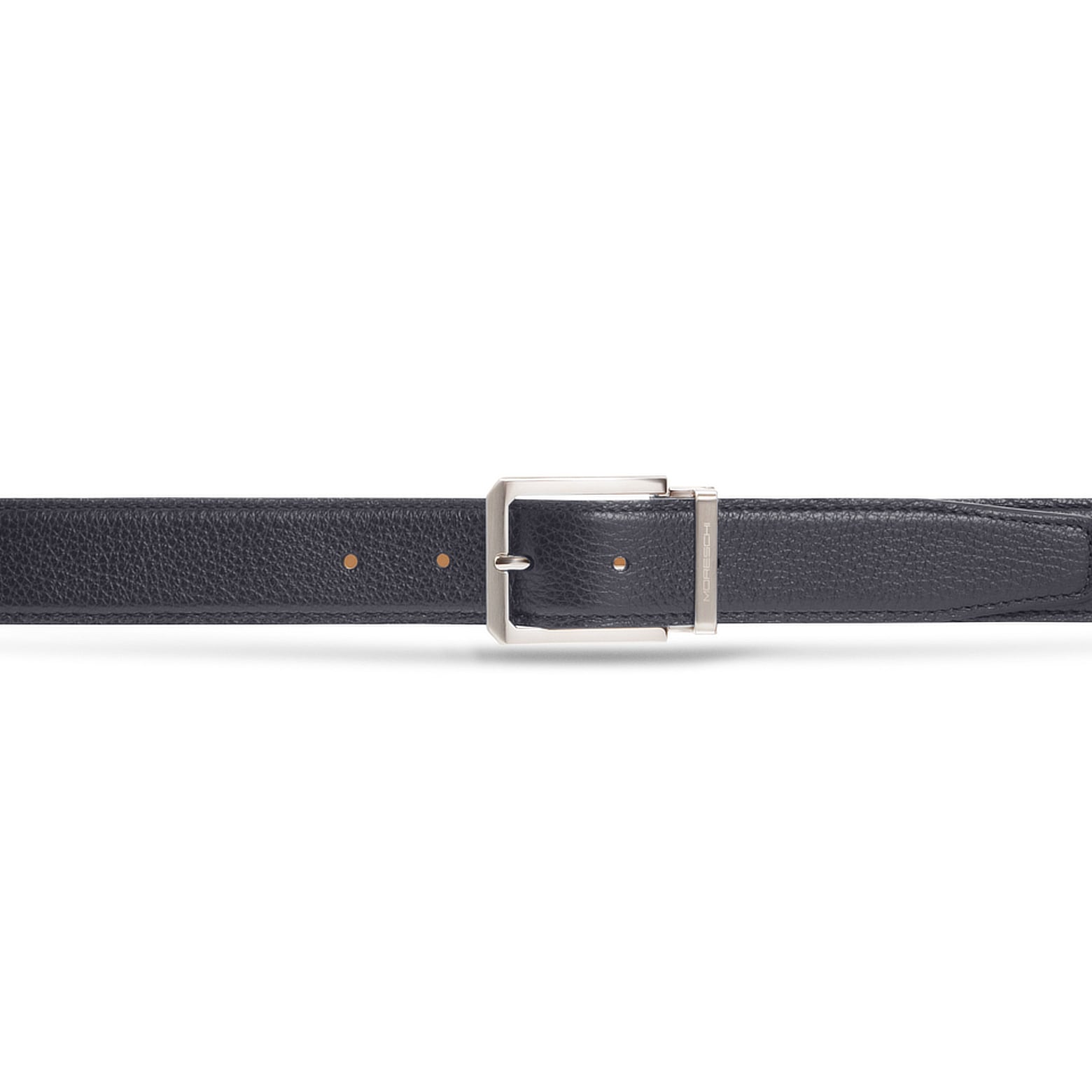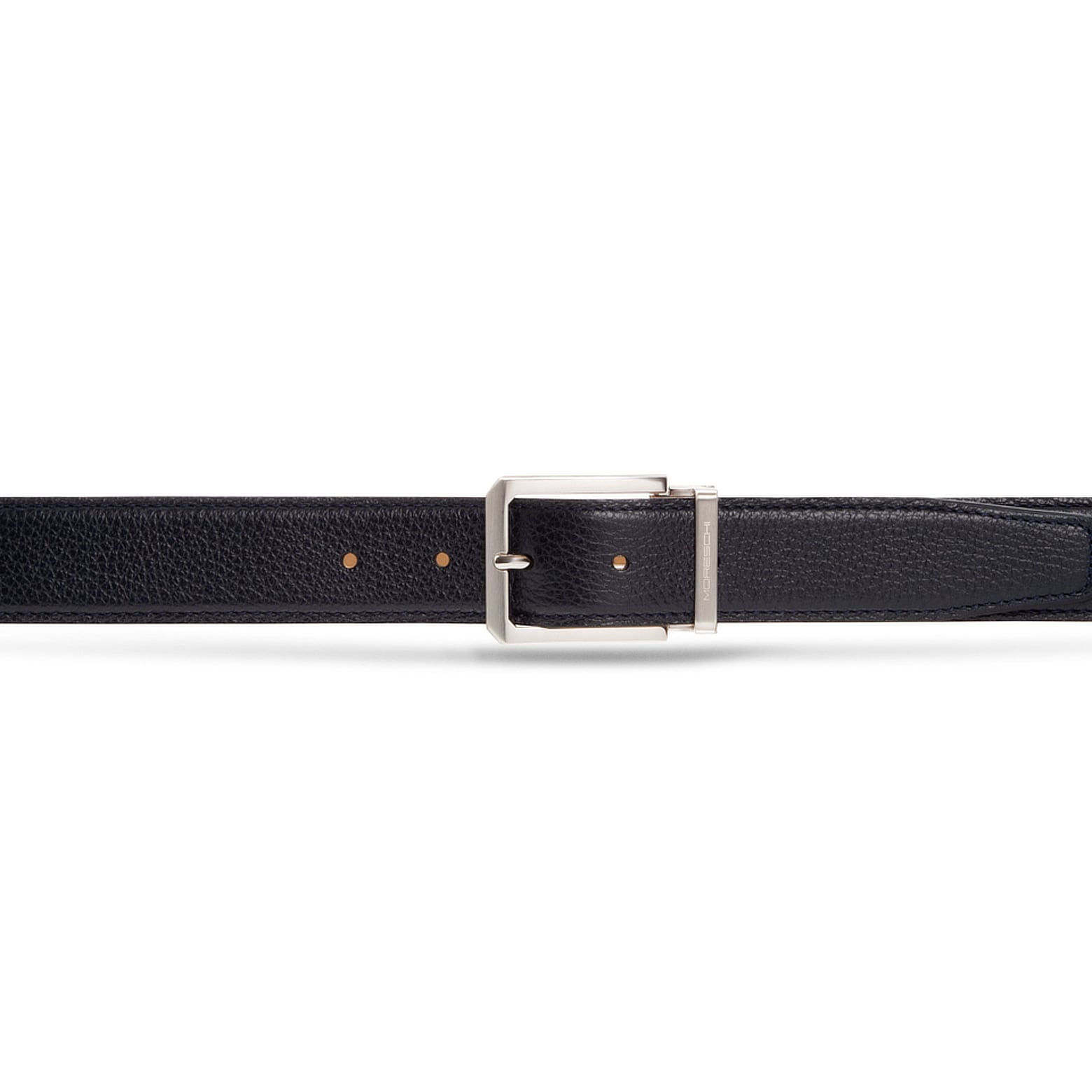 Cintura da uomo cucita, realizzata in morbido vitello dalla grana bottalata. Alta 35 mm, è proposta nel classico colore nero. Il terminale a punta dona al modello un carattere deciso e contemporaneo, mentre la fibbia squadrata in finitura argentata lucida con passante metallico personalizzato Moreschi aggiunge un tocco distintivo di eleganza sportiva. Perfetta in abbinamento alle calzature iconiche del marchio in morbido cervo, completa con stile ogni look formale o casual raffinato.