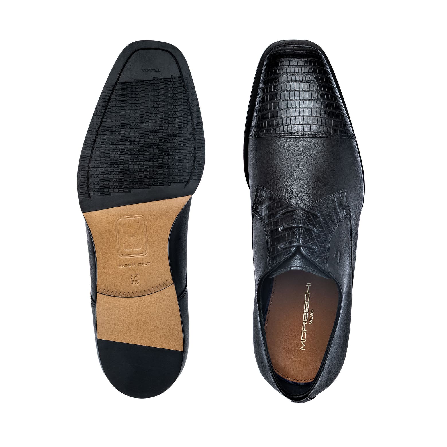 Porta Venezia è un derby da uomo a tre fori che unisce tradizione artigianale e design distintivo. Realizzato in morbido vitello nappato nero con pregiati inserti in tejus tono su tono, è l’espressione autentica dell’eleganza Moreschi. L’alternanza di materiali conferisce profondità visiva alla tomaia, esaltandone il carattere sofisticato e unico.